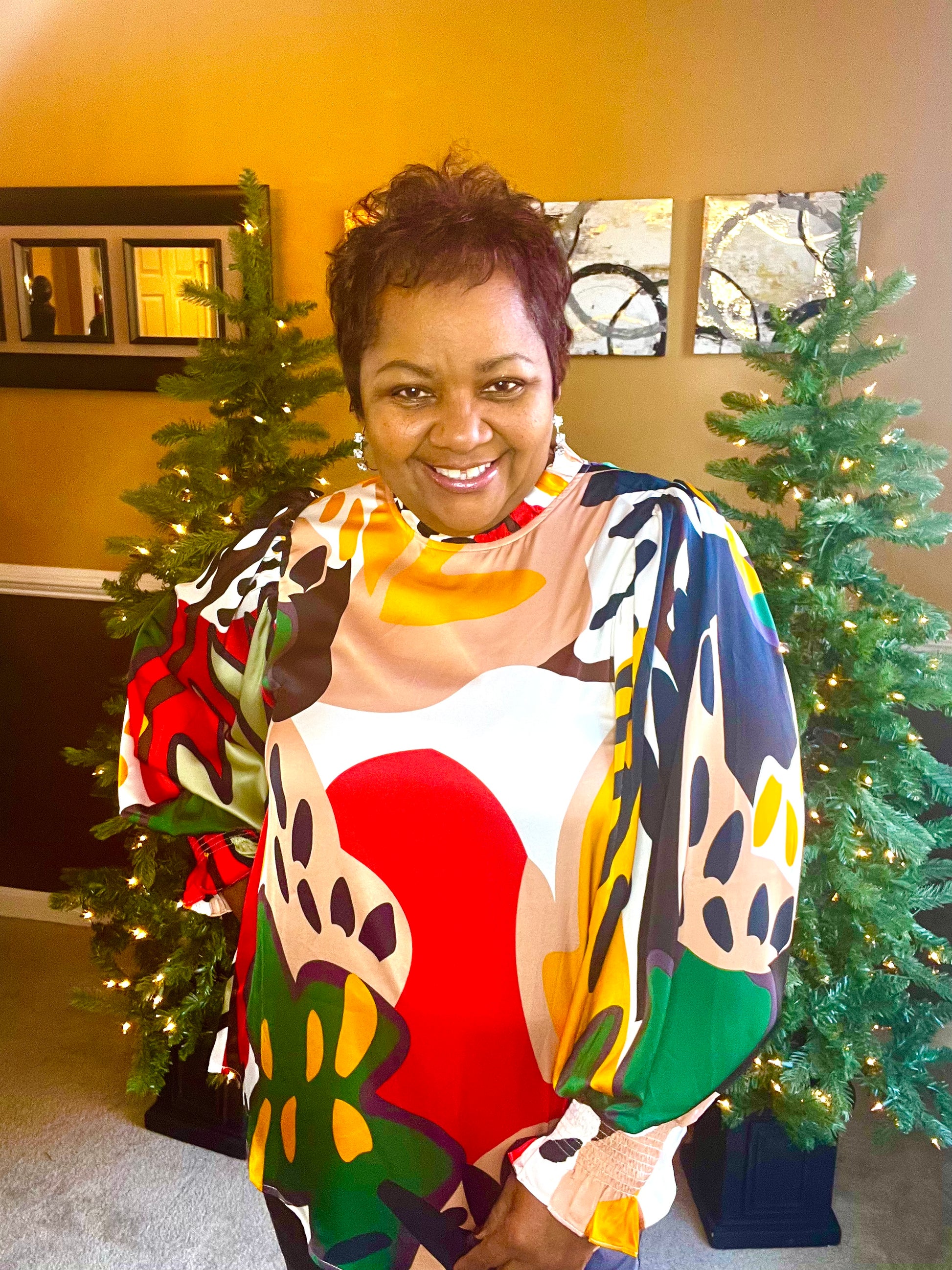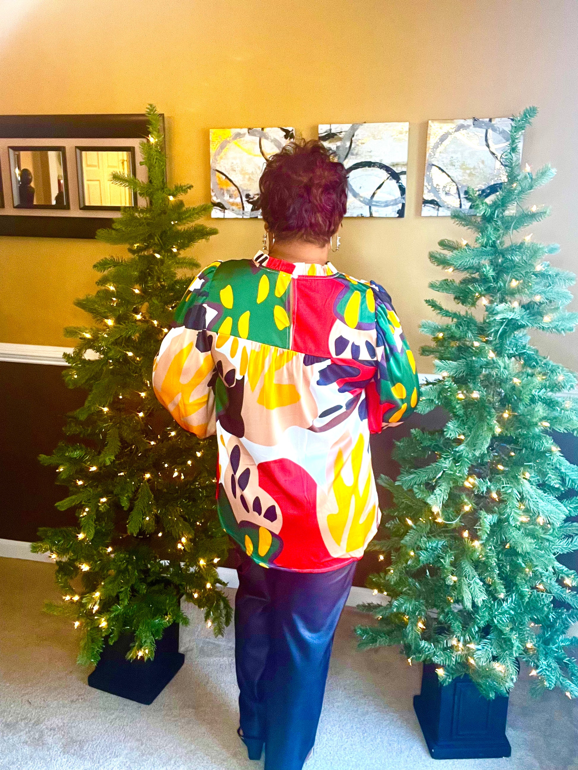 Floral & Plant print top with a frill mock neck, back shirring detail, long bubble sleeves, and smocked cuffs.